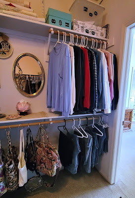 Last time I did a big clean in here, I had plans to add another hanging shoe caddy, get daylight bulbs, add pretty storage and a pretty rug, remove shelving system. I did change out the bulbs, then I stopped there. But by the idea of "addition by subtraction", I don't need to add much else to my closet to make it work for me.