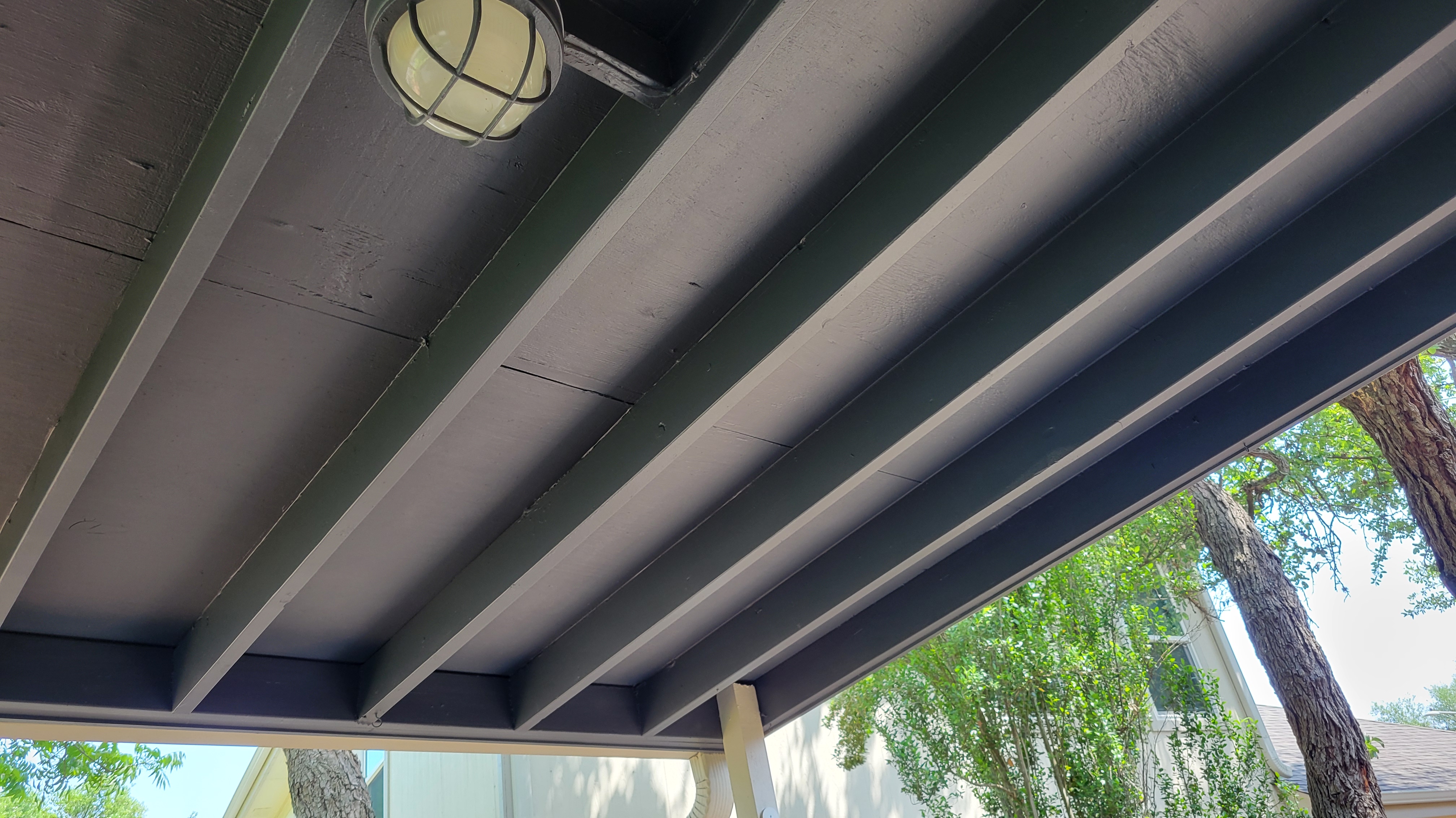 I removed the giant hook that was screwed up here next to the light, and although I don't like that light all that much, it seems more camoflaged up here now. Its amazing what the dark, moody ceiling of the patio lends to this area now.